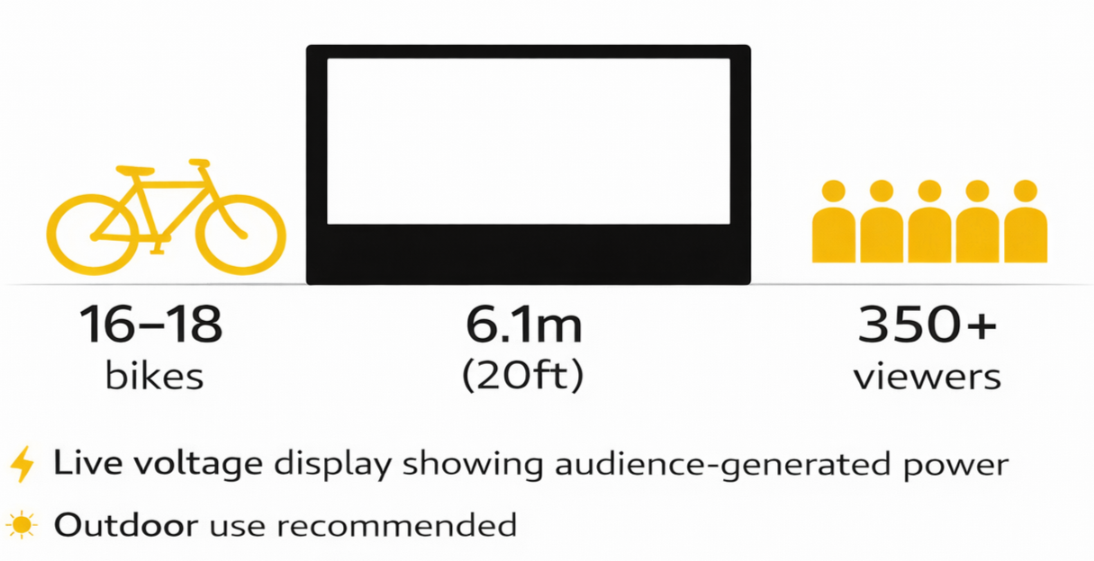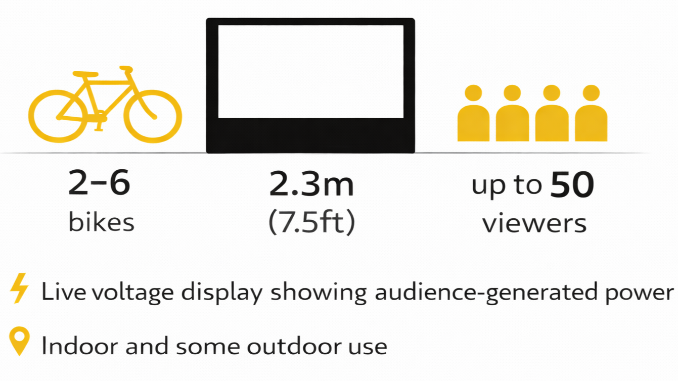 Up to 18 people pedal simultaneously to power the projection, sound and screen in real time. The visible effort behind the energy creates a powerful moment of shared participation, turning audiences from passive viewers into active contributors.