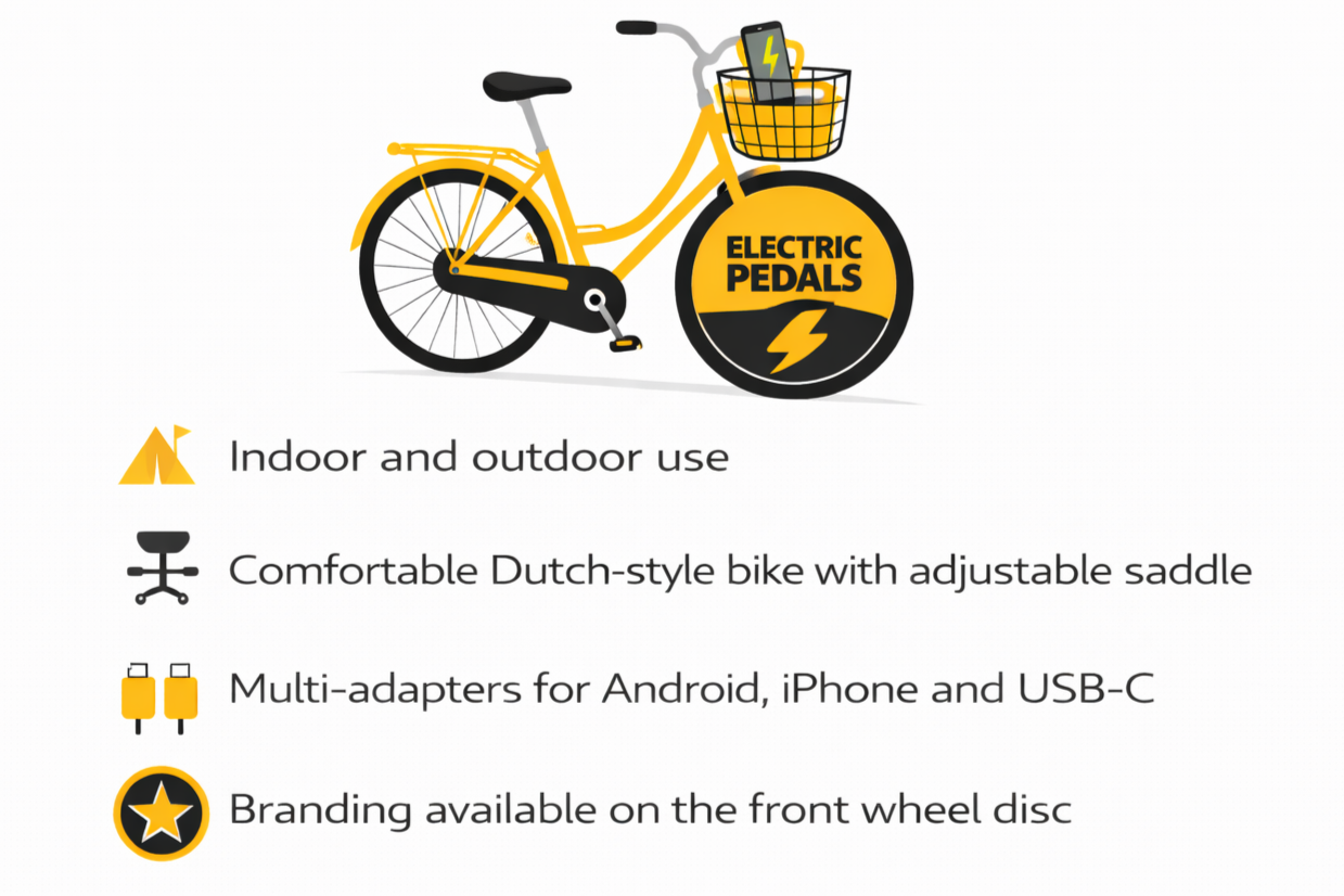 Just hop on, plug in and start pedalling. Charging speeds are comparable to mains power, around 1% per minute. All electronics are neatly housed in the front basket, keeping the bike robust and event-ready. The Basket Phone Charger works equally well at festivals, corporate events, exhibitions and public spaces.